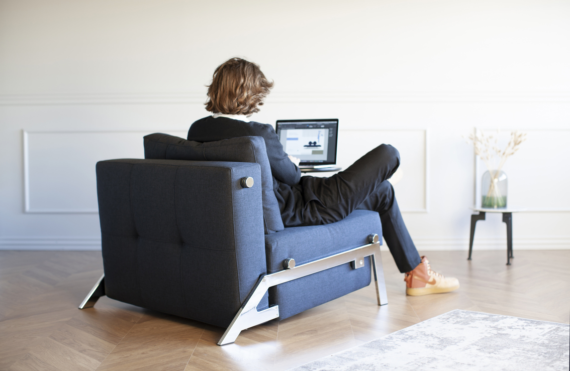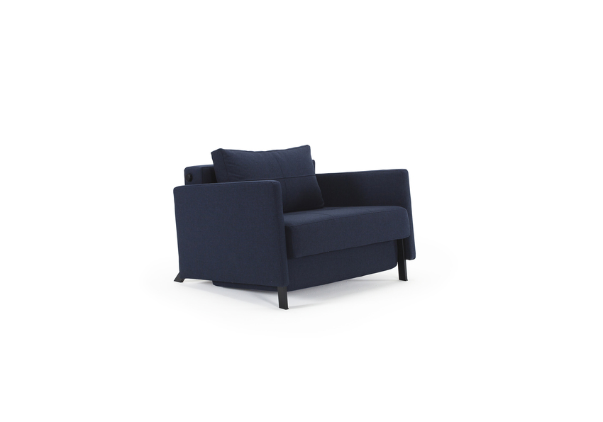 Das Modell Cubed gibt wahlweise mit oder ohne Armlehne und mit drei verschiedenen Fußvarianten (in Eiche, Aluminium oder Chrom). Cubed ist ein Längsschläfer – das heißt, dass die Liegefläche in den Raum hinein geöffnet wird. Auch einen kleinen Stauraum für Bettzeug hat Cubed zu bieten. Liegefläche: ca 90 x 200 cm beim Sessel